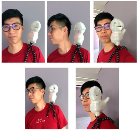 Even though head pose detection has been studied in robotics for many years, there are applications which can be further studied to effectively use a head pose detection method. Pet robots are one of the areas where it can be very useful in establishing human–robot interactions, but was given primitive focus in the literature. The applications of pet robots are manifold ranging from medical, service, and the entertainment industry. For example, a pet robot that we have developed has been used to reduce stress levels of patients [], improve learning abilities of children [], and entertain participants []. With such multi-industry applicability, pet robots with head pose detection can further improve closeness with humans and create effective human–robot interaction models. Even though several pet robots have been designed and developed for various needs in the literature, there is a complete absence of wearable pet robots and human–robot interaction models in wearable pet robots. With known benefits of wearable pets [,], designing a wearable pet robot can provide extensive research and application opportunities in several sectors. In this paper, we present the design and development of a wearable parrot-inspired pet robot, KiliRo, and its human–robot interaction model using vision-based head pose detection. The novelty of this paper is threefold: First, we introduce a new design and development of a wearable parrot-inspired pet robot. Second, we provide the design of human-robot interaction model for wearable pet robots using a vision-based head pose detection method. Third, we quantitatively demonstrate the success of this system through head pose images captured from the robot wearers shoulder in five different orientations.