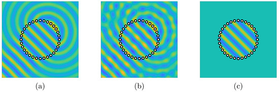 Comparison of two-dimensional sound field syntheses with a circular array: (a) typical interior sound field synthesis in a free-field; (b) typical interior sound field synthesis in a reverberant environment; and (c) undesired propagation-free sound field synthesis in a reverberant environment.