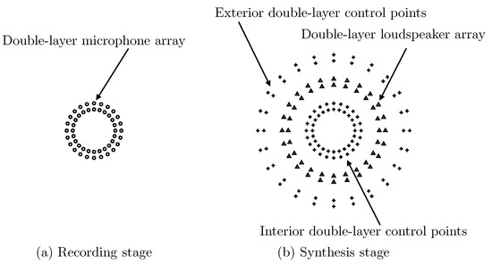 In the synthesis stage, two double-layer arrays of and control points are arranged for simultaneously controlling both the interior and exterior sound fields. In pressure matching approaches, the arrangement of the interior control points is just the same as that of the microphone array in the primary sound field. A secondary sound field is then controlled by a double-layer array of L loudspeakers located between the interior and exterior control points with driving signals of vector (Figure 2b). The secondary sound pressures at the control points are defined as vectors and given: