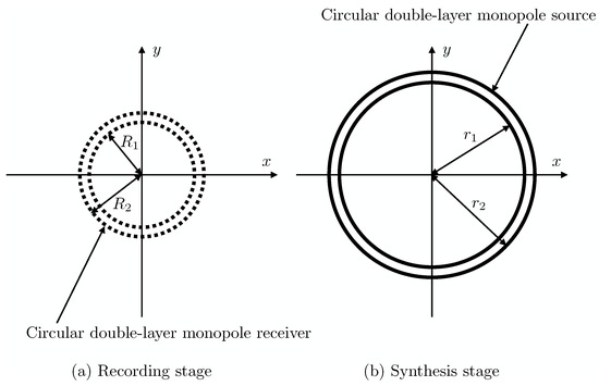 The proposed analytical method can also be easily extended for three-dimensional sound fields by introducing the three-dimensional Green’s function, spherical double-layer arrays and spherical harmonic expansion with the spherical convolution theorem [29] instead of the two-dimensional one in Equation (20), circular arrays shown in Figure 4, and circular harmonic expansion in Equations (12) and (13) with the circular convolution theorem for Equations (21) and (23).