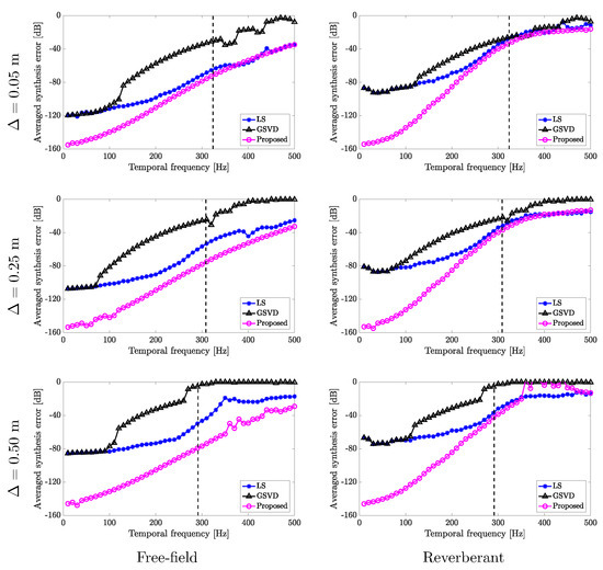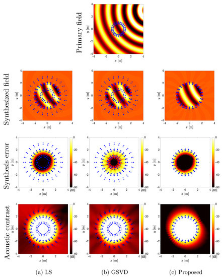 As described above, the conventional GSVD approach reduces the exterior propagation beyond the spatial Nyquist frequency at the expense of the interior synthesis accuracy [39]. The results in Figure 9 show that the GSVD method successfully reduces the exterior propagation over the spatial Nyquist frequency compared with the LS and proposed methods. However, the interior field is no longer synthesized by the GSVD method at higher frequencies (Figure 8).