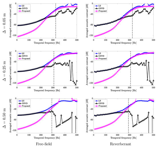 The results in Figure 6, Figure 7, Figure 8 and Figure 9 demonstrate the main impact of this paper; compared to conventional numerical approaches, the proposed method can more accurately synthesize the interior field while reducing the exterior propagation below the spatial Nyquist frequency in both the free-field and reverberant conditions. As described above, this is because the proposed method realizes the highest exterior acoustic contrast and successfully controls both the interior and exterior sound fields in the reverberant condition. These results also suggest the effectiveness of the spatial Fourier transform-based approach compared with the LS method [14,34,41,42].