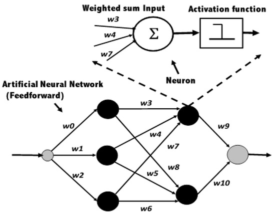 Artificial neural networks (ANNs) are constructed using computational functions known as neurons (Figure 3). ANNs’ architectures include feedforward neural networks and feed-backward or recurrent neural networks. In feedforward-based artificial neural network (FANN), the neurons are arranged in layers with non-cycled connections between the layers [14] (see Figure 3). The first-layer neurons and the last-layer neurons in FANN represent the input and output variables of the function that we are going to approximate. Also, between the first layer and the last layer neurons in the network (i.e., the input and the output layer), there exist a number of hidden layers with weighted connections, which determine how the FANN performs. The output of the neuron in the hidden layer and the last layer are often fed into an activation function (e.g., sigmoid, linear and stepwise functions, etc.) to restrict the output value of the neurons to a certain finite value.