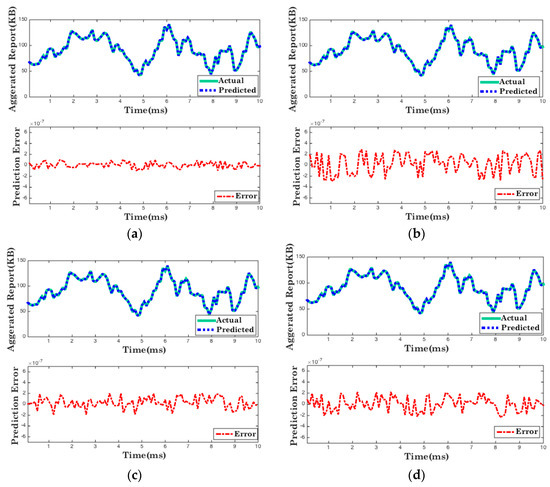 The FANN model settings given in Table 2 are obtained by applying the model selection method reported in [25]. This method is based on constructing a neural network model with a different number of hidden layers and neurons and evaluating the performance of the network in terms of prediction error; then, choosing the model settings that achieve prediction error close to the desired error required by the problem we are going to solve. In our simulation experiment, to evaluate the appropriate model setting for our prediction problem, we started by selecting a small number of hidden layers and neurons and evaluating the performance of the network using them; then we increased the number and observed the prediction error change. We began with one hidden layer and two neurons and noticed that the model failed to converge to the desired error (see the prediction error in Figure 6b). Then, we increased the number of hidden layers to two, with two neurons in each layer, and noticed an improvement in the prediction error toward the desired error (see Figure 6c). After that, we kept the number of hidden layers to two and increased the number of neurons in the first hidden layer to three; then, we obtained the prediction error as depicted in Figure 6a. We again noticed an increase in the prediction error when we further increased the number of neurons in the first hidden layer to four, as shown in Figure 6d. For this reason, we adopted the model settings given in Table 2 to conduct the other simulation experiments in this paper.