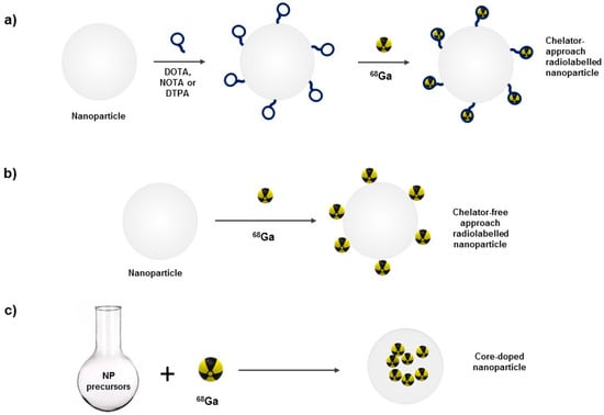 In this radiolabeling strategy, the radioisotope is directly incorporated into the surface of the nanoparticle taking advantage of its affinity towards the nanoparticle surface. On the one hand, the major advantage is that the radioisotope can be incorporated to the nanoparticle in a single step. On the other hand, radioisotope desorption from nanoparticle surface is still the main drawback. Some examples in the literature have exploited this property to produce 68Ge/68Ga generators, to radiolabel nanoparticles with 69Ge as well as to radiolabel iron oxide nanoparticles with several radioisotopes, including 68Ga [8,66,67,68,69,70].