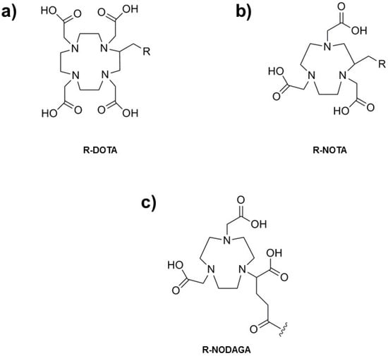 Most common 68Ga chelators: (a) R-DOTA; (b) R-NOTA; and (c) R-NODAGA.