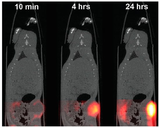 Lymph nodes play a key role in cancer cell metastasis; hence the development of probes capable of targeting and visualizing these structures, has become the main focus of several study groups. Madru et al. [70] developed chelator-free 68Ga-labeled SPIONs. To radiolabel their SPIONs, they incubated GaCl3 with SPIONs in 1M acetate buffer pH 5.5 for different times to assess the best fitting one. They obtained 95% radiolabeling efficiency within 10 min and managed to achieve 97.3% after 15 min of incubation. 68Ga-labeled SPIONs proved to be stable in human serum at 37 °C for 4 h. These SPIONs served as a dual probe for PET/MR imaging of Sentinel Lymph Nodes (SLN), the first node receiving lymphatic drainage from the primary tumor site, in rat models (Figure 5). Evertsson et al. [69] utilized Madru and coworkers’ [70] 68Ga-SPIONs as a contrast agent for magnetomotive ultrasound (MMUS); a novel ultrasound-based method for intra-surgical guidance to localize metastases during cancer surgery. In their study, 68Ga-SPIONs served as a dual-imaging probe for pre-operative PET/MRI imaging followed by intra-operative MMUS imaging in a SLN rat model. Yang et al. [99] used amphiphile-encapsulated iron oxide nanoparticles, radiolabeled with 68Ga using NOTA chelate ligand, to monitor lymph node uptake via PET and T2-weighted MR imaging. High radiochemical yield was obtained (<95%) and stability in human serum was tested in human serum by gel filtration at 37 °C, suggesting nanoparticles are stable in human serum under physiological conditions.