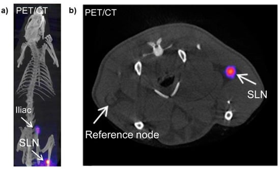 (a) PET/CT imaging 3 h post subcutaneous injection of 68Ga-SPION. Arrow shows nanoparticle accumulation in SLN (popliteal) and iliac nodes; and (b) axial PET/CT slice 3 h post subcutaneous injection of 68Ga-SPION. Arrows point SLN and reference nodes. Adapted from Madru et al. [70].