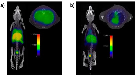 Cartier et al. [161] labeled poly2,3-epoxypropylmethacrylate (EPMA) latex nanoparticles in a chelator-free manner with Gd3+ for MRI, 111In for gamma scintigraphy or 68Ga for PET imaging. 68Ga nanoradiotracer was obtained with 0.2 MBq/mg nanoparticles. It was posteriorly injected in Wistar rats to assess biodistribution using PET imaging. Fifteen minutes post-injection, one can mainly observe liver, spleen and heart accumulation.