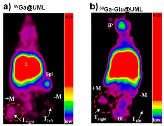 (a) PET image 30 min post 68Ga radiolabeled liposome injection (without glucose in the formulation); and (b) PET image 30 min post 68Ga radiolabeled glucose liposome injection. The arrows show tumors. IP, injection point; K, kidneys; L, liver; Spl, spleen; Bl, bladder; M, magnet; Tright and Tleft, tumors. Adapted from Malinge et al. [119].