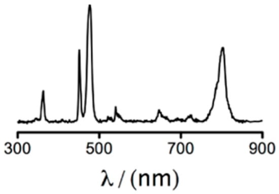 Fluorescence emission spectrum for UCNPs doped with several lanthanides after excitation with CW laser at 980 nm [139]. Multiple emission peaks can be observed at 360 nm, 451 nm, 476 nm and 800 nm.