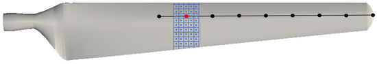 As a pre-processing step, the blade is split into a selected amount of elements. Each of these elements has a central node, which is represented by a big red dot in Figure 1. All big dots represent one final design parameter each. The amount of design parameters is chosen beforehand by the user. The number can be controlled by adapting a dictionary that is defined for the usage of the developed tool. In this exemplary case, there are nine design parameters. For one exemplary element, the structured grid is shown with thin blue lines. In the figure, the represented grid has been coarsened for the sake of clarity. Within each cell of this grid, the small blue dot represents the local gradient of each grid cell, computed via the adjoint approach. The adjoint gradients are then transferred onto the nodes depending on the distance of the local cell to the central node of the element. Evaluating the projected gradients then leads to a movement of the nodes, which act like beam nodes. The difference to FSI is that the structure is not solved, and it is assumed that any movement given by the gradients can be realized. This assumption is necessary for the presented optimization. The final, optimized geometries can be used within the blade design process as an input to the design of the structure, for example when passive control shall be applied. Therefore, the structure is not final when the optimization takes place. In addition, the movement of the blade due to a structural response might interfere with the movement given by the gradients.