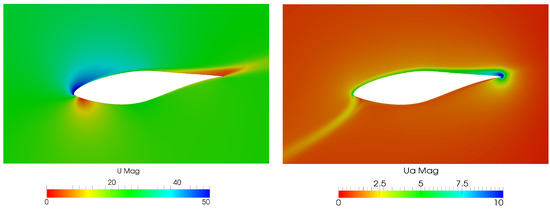 Magnitude (Mag) of the velocity U and adjoint velocity around the blade at a cut at 3 m of the span.