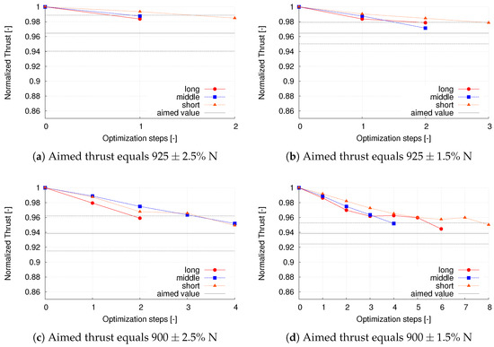 For all plots, the linear lines between the points are added to ease the following of the trend, whereas only the dots represent computed values of the actual geometries of the blade during the optimization. The thrust is normalized by the initial value of N to ensure comparability of the different aimed values and convergence ranges. The aimed values equal 925 N for the upper plots (a) and (b) and 900 N for the lower plots (c) and (d). The left plots are for the wider allowed range of around the aimed value, whereas the right plots are for a range of around the aimed value.
