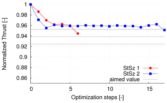 Development of the normalised thrust force over the optimization steps for the long blade part. The aimed force is N and the initial step sizes are (red dots, StSz1) and (blue squares, StSz2).