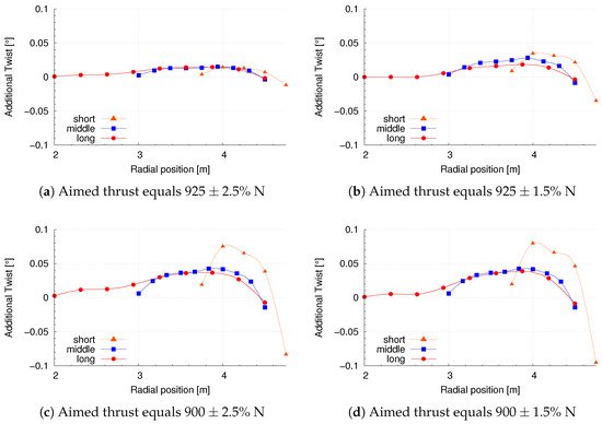 The final additional twist of the blade for the various optimization cases is shown in Figure 7a–c. The dots represent the moving element nodes where the gradients of each element are projected on (see Figure 1). The lines represent the smoothed movement between the nodes, as the geometry movement is also smoothed by the optimization tool. This plotted twist is then added to the initial twist of the according blade. The shown twist are the final ones, summed up over all optimization steps.