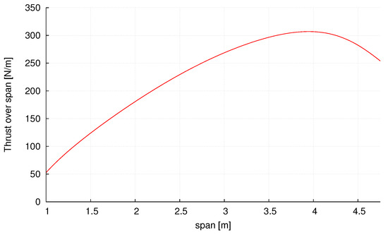 It can be seen that the thrust production increases in the spanwise direction until a peak at a radial position of m. Afterwards, the production of thrust decreases. Thus, the gradients follow the trend of production of thrust in size and direction, leading to a larger deformation around m and decreased deformation towards the tip.