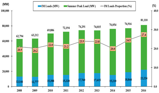 From Figure 3, one can notice that the proportion of IM loads in the system load shows a steady increase over the years. The consumption of IM loads becomes 27.4% in 2016. The increasing tendency of supply and use of IM loads directly affects the maximum demand. Also, an increase in the IM loads might cause an imbalance between the supply and demand, resulting in degrading the energy utilization efficiency and deteriorating the stable supply of electric power.