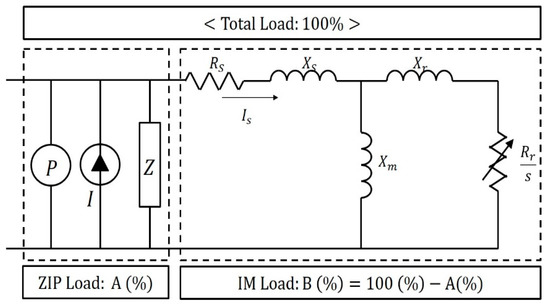 For the stable operation of a power system, the balance between electrical inputs of the generator and electrical outputs of the system loads has to be kept all the time. Therefore, it is important to have an accurate knowledge about the characteristics of the load for stability analysis. For example, the load that consumes the power transmitted from the substations connected to the buses of the power system depends on the voltage and frequency. However, due to the complexity and diversity of the power system load, their modeling remains a challenging task. Therefore, such load modeling is needed that well represents the steady-state and transient behaviors of the physical loads of the systems. This paper adopts the composite load model, which is the combination of a static part with the constant impedance-current-power (ZIP) model and a dynamic part with the high-order IM model. The so-called ZIP plus IM model is widely employed because of the ability to express load dynamics accurately and its simple structure, and the model is especially used to analyze short-term voltage stability because dynamic response of loads is a key mechanism of it [23]. The detailed explanation of the composite load model can be found in [36,37,38,39,40], and it is explained in the following sections. The structure of the load model used in this paper is shown in Figure 1.