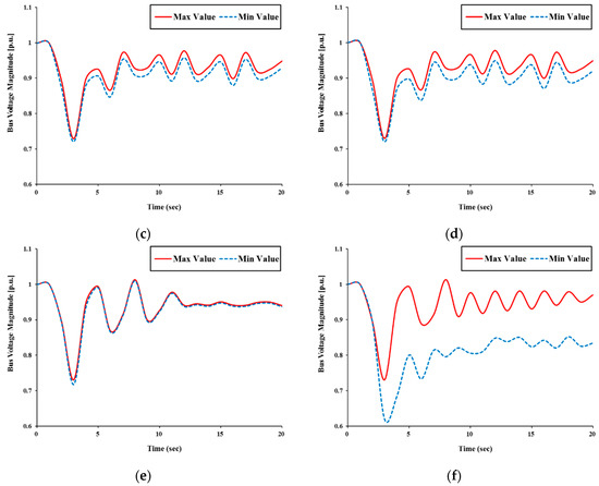 When the applied proportion of IM loads was 30% or 40%, it can be seen that the voltage recovery characteristics were similar, regardless of the change of . When the proportion of IM loads was 50% and the value was increased, voltage instability occurred. The power system voltage did not recover due to the generator angle stability problem. A low value of becomes a severe situation, but a high value of makes the situation of the systems less severe. When the IM loads suffer a sustained low voltage, they consume excessive reactive power. According to the results, the equilibrium point of the system did not exist. In addition, if fault clearing was not quickly applied, the kinetic energy of the IM load was increased and the voltage could not be recovered. This short-term voltage instability problem is greatly affected by the proportion of IM loads. If the proportion is low, the voltage recovery is fast, but if the proportion is high, the voltage recovery might be slow, or the system might experience voltage collapse [30]. Figure 6 shows the results of the effect of IM load proportion on the system behaviors, assuming that the proportion of IM loads is about 30–50%.