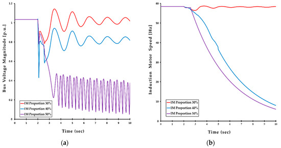 Effect of IM loads proportion on power systems. (a) Bus voltage magnitude. (b) IM speed.