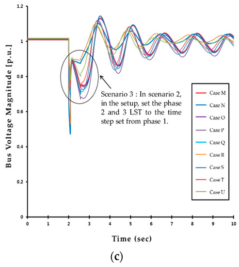 Results of bus voltage recovery depends on load shedding amount (LSA) and load shedding time (LST). (a) Scenario 1: Set the LST in a constant time step in phase 1, 2 and 3; (b) Scenario 2: Set phase 1 LST to 0.3 s and phase 2 and 3 to set LST in scenario 1; (c) Scenario 3: In scenario 2, in the setup, set the phase 2 and 3 LST to the time step set from phase 1.