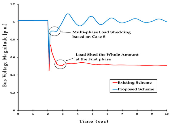 The decision for load shedding is usually made by system operators, based on pre-established practical criteria. However, the existing UVLS scheme does not consider the dynamics of IM loads. When severe faults are applied to the systems, motor stalling might happen due to the reduced rotation speed of IMs. Because the existing UVLS scheme only considers the ZIP model in dynamic analysis, the effect of motor stalling on voltage recovery cannot be reflected by the scheme. For systems with a high portion of IM load, voltage reduction below a certain level after disturbances might cause voltage instability or DVR. To reduce load interruption, in this situation, adequate countermeasures should be taken, such that the controlled load shedding schemes and countermeasures should be carefully determined, considering the dynamical behaviors of IM loads. Comparison results of bus voltage recovery for existing schemes and the proposed scheme are shown in Figure 8.