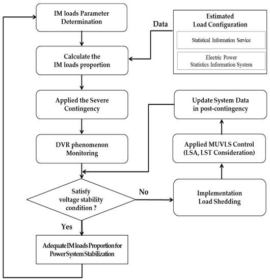 In this study, the objectives of the simulation are to determine the adequate IM load proportion in the Korean power system. In addition, the MUVLS control strategy was applied to a practical system in order to verify the DVR mitigation effectiveness. Case studies on the Korean power system have validated the performance of the proposed MUVLS scheme under severe contingency scenarios. As mentioned earlier, the proportion of IM loads occupied about 30% under summer peak conditions. Therefore, since the proportion of IM loads is expected to increase continuously due to abnormal weather conditions, to perform dynamic analysis simulations of the appropriate proportion at which the power system could stabilize, the IM load proportion was increased by 1% from 30%. When applying the proposed MUVLS strategy, the process monitors whether to satisfy the voltage stability condition. If this condition is satisfied, it is possible to discuss the adequate proportion at which the dynamic characteristics of the IM loads can restore the voltage of the power system to ensure short-term voltage stability. Figure 9 shows the flowchart of the algorithm for the method proposed in this paper.