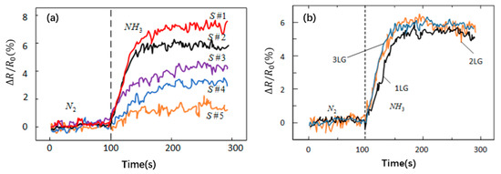 | 4 | CVD Gr | NH3 | 9.3 × 10−5 ppm−1 | 17 ppm | 10 min | 2017 | [63] |