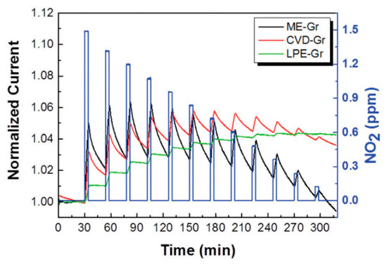| 9 | CVD-Gr | NO2 | ∆I ≈ 0.0025 A | 0.12 ppm | 4 min | 2017 | [74] |