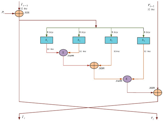 The algorithm possesses two main sub-key groups, namely, the 18-entry P-boxes (permutation boxes) to perform bit-shuffling and four 256-entry S-boxes (substitution boxes) to perform simple nonlinear functions. Here, the S-boxes receive 8-bit as input and yield 32-bit output. The working principle of a single blowfish round is shown in Figure 2. The function F is the Feistel Function of Blowfish that splits half the 32-bit block in 8-bit chunks (quarters) and employs this quarter as input to the S-box. Subsequently, the outcomes of S-boxes are supplemented with the dropped carry, consequential in MOD 232 addition, and finally XOR operation has been performed. Conversely, the decryption process has been carried out by reversing the blowfish algorithm and is simply done by inverting and cipher blocks as well as by employing the P-entries in reverse order. Blowfish algorithm is generally divided into two sections, namely key-expansion and data encryption.