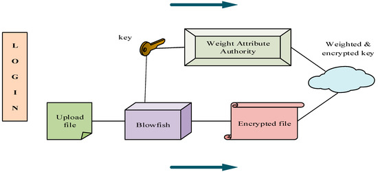 - Encryption: Before uploading a data file to the cloud, the data holder initially logs in with a unique ID, and then randomly chooses a symmetric data file encryption key to encode the data. Furthermore, the data holder defines a “weighted threshold access structure” (W) for the corresponding data users and the data files and then encrypts the data with W as shown in Figure 3.