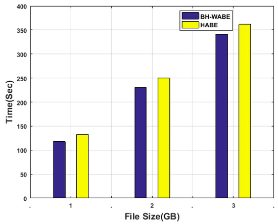Decryption time: The inverse process of encryption process is termed as decryption process. However, the decryption time is defined as the time that a decryption algorithm takes to yield a plaintext from a ciphertext. The decryption time for the conventional HABE and the proposed BH-WABE is analyzed in Figure 6.