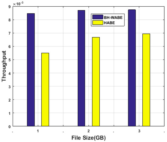 Throughput: The ratio of the encrypted data file to the encryption time is referred as throughput. In Figure 7 it is seen that the throughput estimated from the proposed BH-WABE scheme is high when compared to the conventional HABE scheme.
