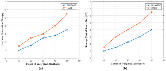 Cost of user secret key generation. (a) Time cost analysis; (b) Storage cost analysis.