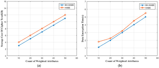 Cost of cipher text. (a) Storage cost analysis; (b) Time cost analysis.