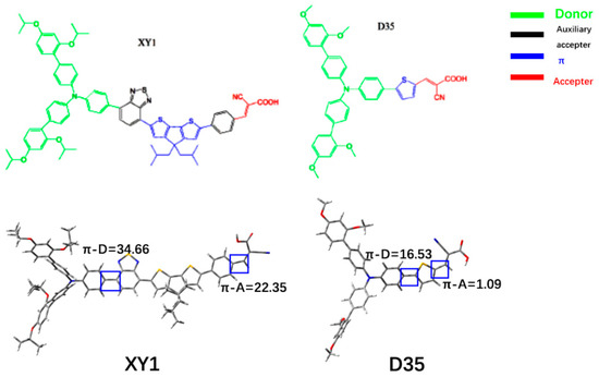 As shown in Figure 1, the two isolated dyes in acetonitrile solvent display special dihedral angles of 1.09° and 22.35° degree for D35 and XY1 between the thiophene and benzene and hydroxy acrylic acid. Compared with the XY1, D35 tends for the coplanar structure, and electrons are easily moved from donor to acceptor through the conjugated bridge, and further injected into TiO2. At the same time, D35 exhibits a well-conjugated degree in the middle region of molecular structure (i.e., dihedral angles are 16.53 for D35 and 34.66 for XY1, respectively). It is worth noting that the twisted angles among donor units for XY1 are larger than those of D35 that can reduce the dyes’ aggregation due to the repellent interaction.