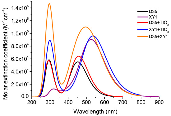 Figure 2 shows the Highest Occupied Molecular Orbital (HOMO) and Lowest Unoccupied Molecular Orbital (LUMO) levels for two dyes, and Table S1 lists the energy data and energy gap. From Figure 2, it was found that the energy level of the TiO2 semiconductor (4.0 eV) is much less than the energy level of the LUMO dyes, which is beneficial to the electronic injection (excited dye → TiO2). Comparing the LUMO of the two dyes, it was found that D35 is higher than that of XY1, meaning that CT could take place from LUMO of D35 to XY1, producing intermolecular CT. Furthermore, the higher HOMO energy level for XY1 can minimize energy gap (D35 and XY are 2.28 and 1.98 eV, respectively), leading to the red-shifted absorption peak. The smaller band of cosensitized system should reflect the tendency of broadened absorption spectra, which will compensate for the inadequacies of isolated dye absorption. The improvement in spectra for cosensitization will enhance the solar utilization affecting the overall efficiency. For cosensitized systems (D35 + XY1), the energy gap is close to that of the XY1 due to the near HOMO energy level with XY1 that can be chalked up to the contribution of XY1 for cosensitized HOMO (see Table S1). As a whole, energy levels of XY1, D35, and XY1 and D35 have good matching with the semiconductor band.