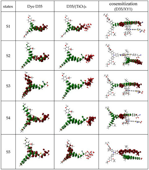 Figure 4 shows the Charge Different Density (CDD) for calculated excited states. For the S1 state, red electron is moved in a direction of the acceptor; the green hole resides in the donor unit, resulting in the electron transfer from donor to acceptor. For another excited state (S2) of D35, electron transition is composed of HOMO → LUMO + 2, having a weight of 74%, which state is also an intramolecular CT from the triarylamine unit to cyanoacrylic acid. The above states exhibit a strong push–pull behavior characteristic. States S4 and S5 are also ICT states with the same characteristics as S1. Located excited state is found to be the S3 state that is an excitation of donor and bridge.