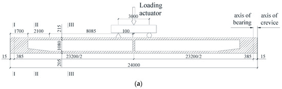 The PC beam had a rectangular hollow cross section measuring 700 mm (width) × 1500 mm (height) and a length of 24,000 mm (net span 23,200 mm). The end of the girder specimen had a solid section to accommodate the application of the post-tensioning force. The detailed dimensions are shown in Figure 1.