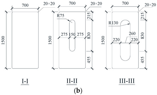 Detailed dimensions of the specimen (unit: mm): (a) Front of elevation; (b) sectional view.