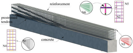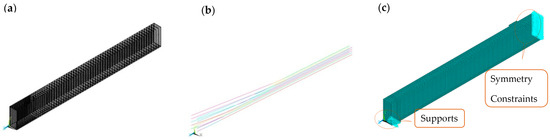 The reinforcement and prestressed tendons were simulated using a 3D two-node link element, namely LINK 180, as shown in Figure 10a,b. The modulus of elasticity was regarded as constant. No relative slippage between concrete and reinforcement was considered, as well as prestressed tendons [34]. The prestressed forces in tendons were applied by defining an initial strain. Tendons had been united with the concrete by establishing reasonable constraint equations between tendons nodes and concrete nodes.