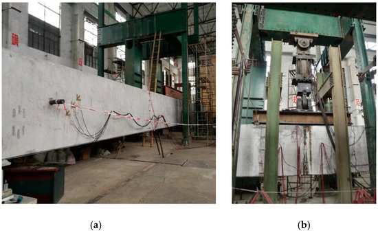 The loading tests were conducted in the Structures Laboratory at Southwest Jiaotong University. The load was applied with a Material Testing System (MTS) electrohydraulic servo actuator (Eaton Corporation Automation Products Division, Troy, MI, USA), while the loading point at midspan was divided into two points as shown in Figure 1. The test setup and the loading site are shown in Figure 4 and Figure 5, respectively.