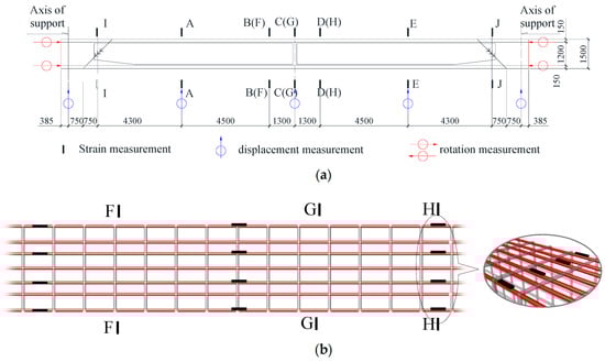 (4) Reinforcement Strain Measurement: The reinforcement strain was determined by resistance strain gauge located on the corresponding position on section F-F, G-G, and H-H. There were seven outer longitudinal bars (N3) in the top and bottom slab. The measurement points were arranged on them longitudinally in the interval of one, as shown in Figure 6b. The number of strain measurement points of the bars in top slab was 4, as well as the bars in bottom slab. There were totally 24 measurement points for obtaining the strain of reinforcement.