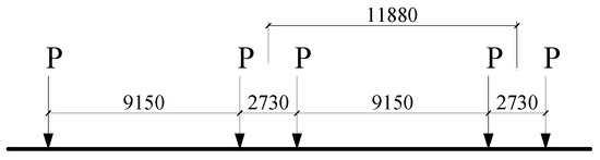 Similar to the method of calculating the lower limit load, the upper limit of fatigue load is based on the most unfavorable combination of the maximum standard load (secondary dead load plus variable load considering impact factor). The variable load is calculated in the case of the train is fully loaded, that is, P = 120 kN, as shown in Figure 7. Considering a reduction coefficient as 0.9 provided by the architect, the upper limit is calculated as 348 kN. The design details of fatigue test are characterized in Table 4.