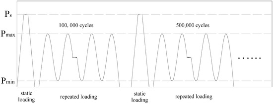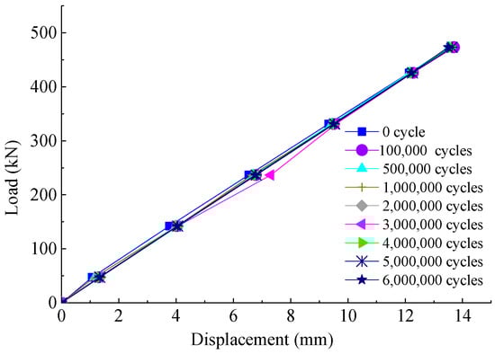 During the fatigue loading test, the repeated loading was first periodically paused and the specimen was unloaded to zero when the fatigue cycle ranges to 0 time (before the test), 100,000 times, 500,000 times, 1,000,000 times, and every 1,000,000 times thereafter until 6,000,000 times. Then the dial gauges were placed, ensuring the pointers were in sufficient contact and zero the dial gauges [32]. Subsequently, the load was loaded sequentially from zero to the maximum static load Ps at the step shown in Table 4. At the interval time of each grade of post-fatigue static load and when digits of the dial gauges became steady, the deformation and strain information of the structure were monitored. The crack was observed in the web, top, and bottom slab throughout the test. The complete loading procedure of the test is shown in Figure 8.