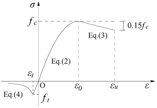The three-dimensional finite element model was established based on the commercial finite element program ANSYS. Concrete was simulated using a 3D eight-node solid element, namely SOLID 65. As shown in Figure 9, a model proposed by Hognestad [33] was applied to describe the compression constitutive relationship of concrete as follows: