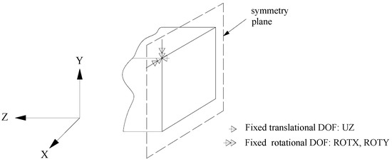 Due to the symmetry of the specimen, only a half of the structure was modelled, with symmetric constraints on the midspan section, as shown in Figure 10c. A schematic of the symmetric constraints is shown in Figure 11.