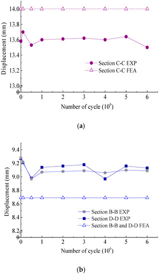 Displacement versus cycles: (a) section B-B and section D-D; (b) section C-C. “EXP” represents experimental result, and “FEA” represents finite element analysis result.
