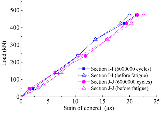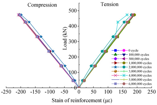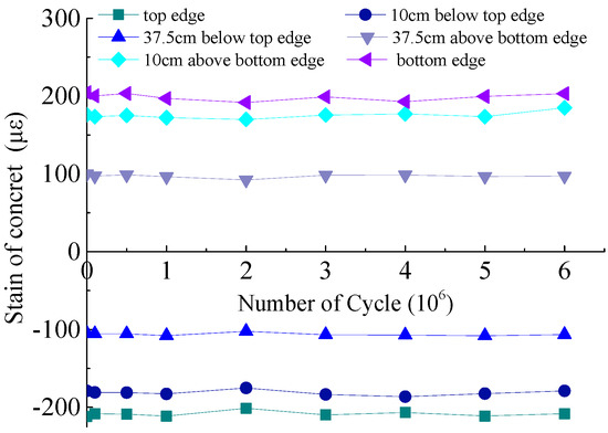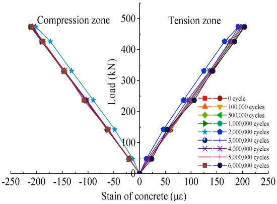 With the increase of the fatigue loading cycle, the development of concrete stain at midspan when the maximum static load was applied is shown in Figure 14. The strains measured at these measuring points are almost constant except for a slight fluctuation at 2,000,000 cycles, similarly as the other sections. Figure 15 shows the relationship between the applied load and concrete strain in compression and tensile concrete in a post-fatigue static load test. Curves have a good coincidence except for a slightly difference at 2,000,000 cycles. Both of the compressive and tensile strains are linear with the increase of static load. The maximum strain in compression zone is −213 με, while that in tensile zone is 208 με. The concrete strain of pre-camber was counted in, and the actual strain is much smaller. No crack was observed throughout the loading-unloading process and the concrete was in linear-elastic, which complies with the design intention of a fully prestressed concrete component.